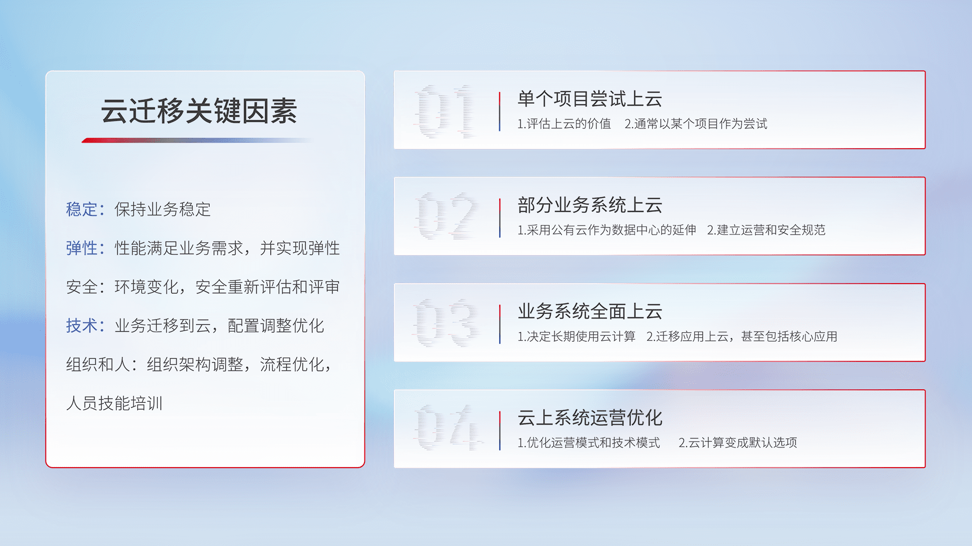 结合实际业务,,,从规划设计、、、云平台选型、、云原生改造、、、、数据迁移、、集成交付,,,,迁移全过程为客户识别最佳上云路径,,做好风险识别管理,,设计网络架构、、、身份权限、、安全审计合规、、、、操作审计、、日志审计、、监控告警策略、、多站点容灾设计等,,,对云上基础设施进行整体规划,,,,提升IT治理水平,,,,以满足弹性、、高可用、、、、高性能的需求。。。。