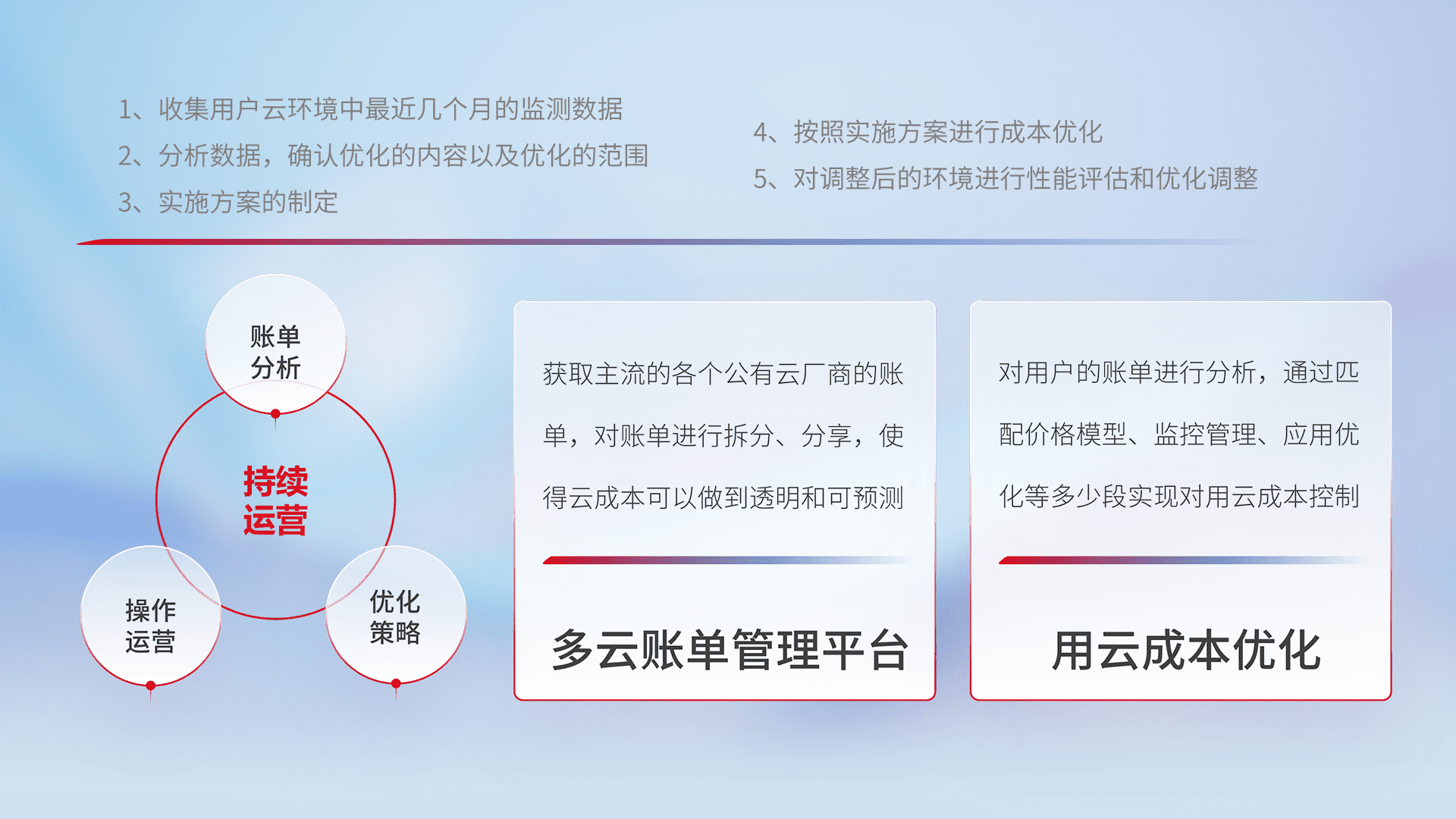 通过多云纳管,,,以统一的资源数据模型把客户的云资源进行抽象和封装,,,,进而实现对多云资源的统一操作,,,保障云资源管理的可靠性、、稳定性与可用性。。。。量身定制化运维内容,,配置、、、、开发运维、、、、补丁管理、、、备份、、、监控、、、认证和访问管理、、、审计和日常巡检等,,,,保障在用云过程中的可靠度,,,稳定度以及高可用率。。。。